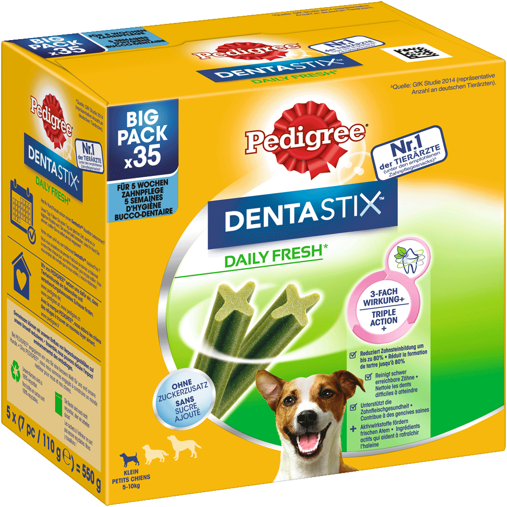 PEDIGREE&reg- DENTASTIX&trade- Daily Fresh sind für kleine Hunde von 5 bis 10 kg geeignet. Die speziellen Kauknochen für die tägliche Frische sind einzigartige X-f&ouml-rmige Zahnpflegeprodukte, die wissenschaftlich erwiesen dazu beitragen, die Bildung von Zahnstein bei täglicher Fütterung um bis zu 80% zu reduzieren. PEDIGREE&reg- DENTASTIX&trade- Daily Fresh enthalten eine einzigartige Wirkstoffmischung aus Grüntee-Extrakt und patentiertem Eukalyptus&ouml-l, die nachweislich helfen, den Atem zu erfrischen. Sie sind lecker, fettarm und frei von künstlichen Farb- und Aromastoffen und haben keinen Zuckerzusatz.