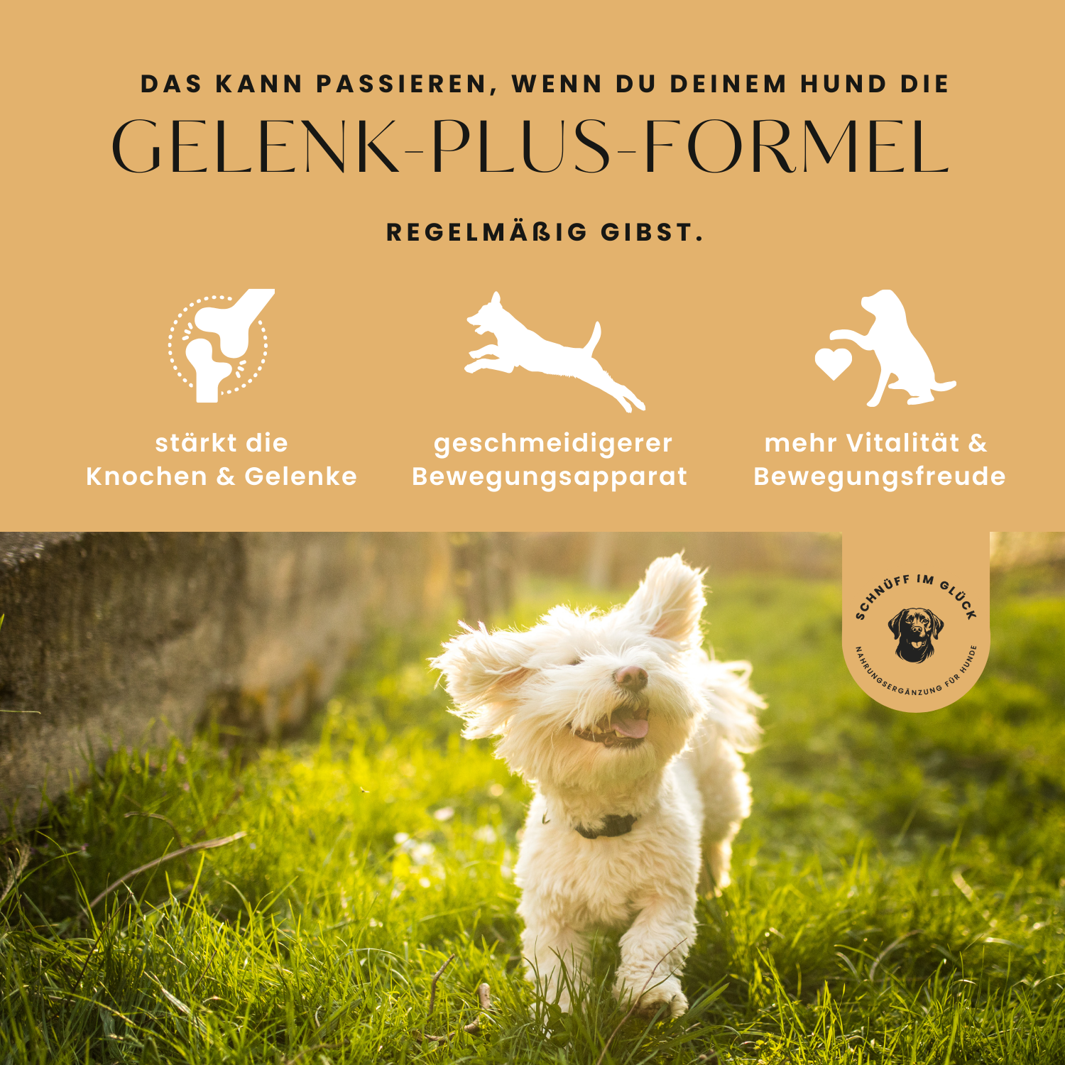 Die Gelenk-Plus Formel, entwickelt in enger Zusammenarbeit mit Tierärzten, unterstützt mit bewährten Wirkstoffen aus der Natur die Knochen und Gelenke Deines Hundes.