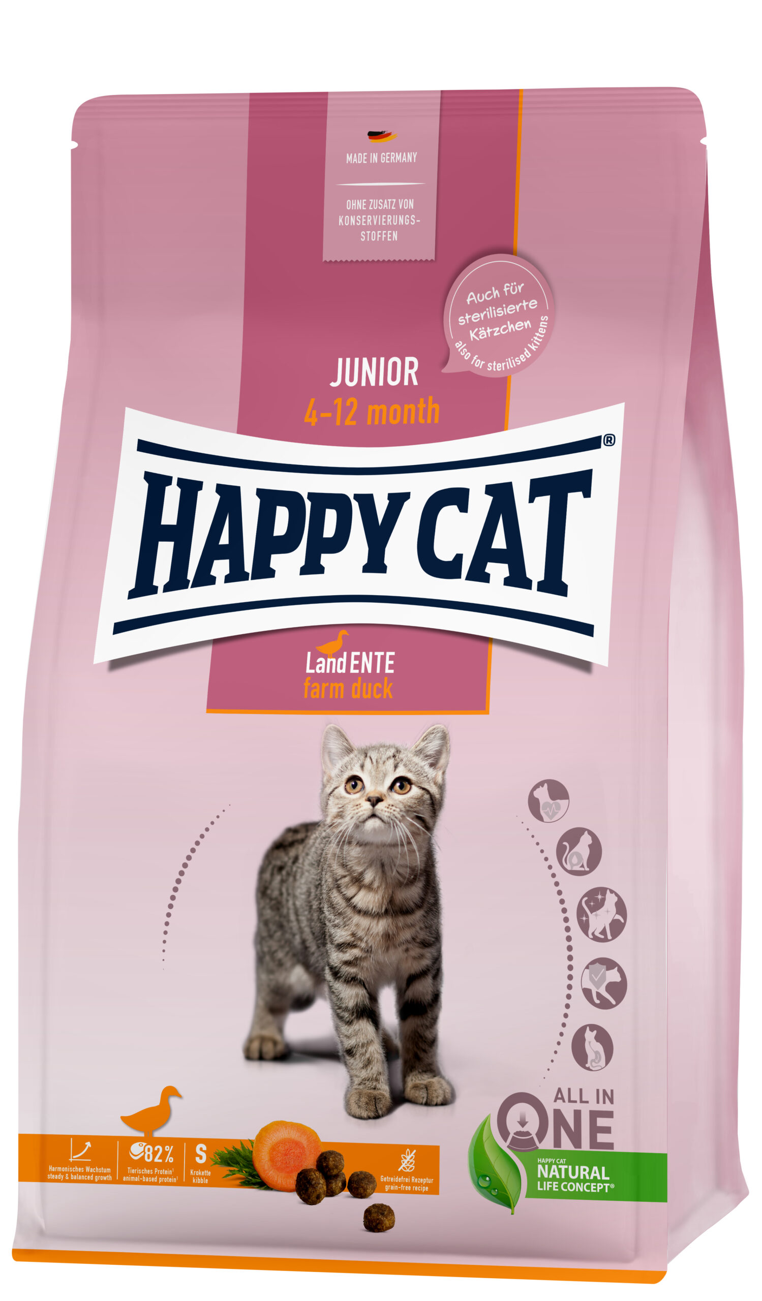 Die getreidefreie Rezeptur von Happy Cat Junior Land-Ente mit zarter Karotte ist leicht verdaulich und die optimale Basis für ein harmonisches Wachstum. Das Zusammenspiel von hochwertigen Zutaten, einer ausgewogenen Nährstoffkombination, sowie lebensnotwendigem Vitamin C unterstützt die k&ouml-rpereigenen Abwehrkräfte und f&ouml-rdert das Wohlbefinden von Katzenkindern. Die kleinen Kroketten mit ihren wertvollen Inhaltsstoffen sind ideal für heranwachsende Jungkatzen vom 4. bis zum 12. Monat.