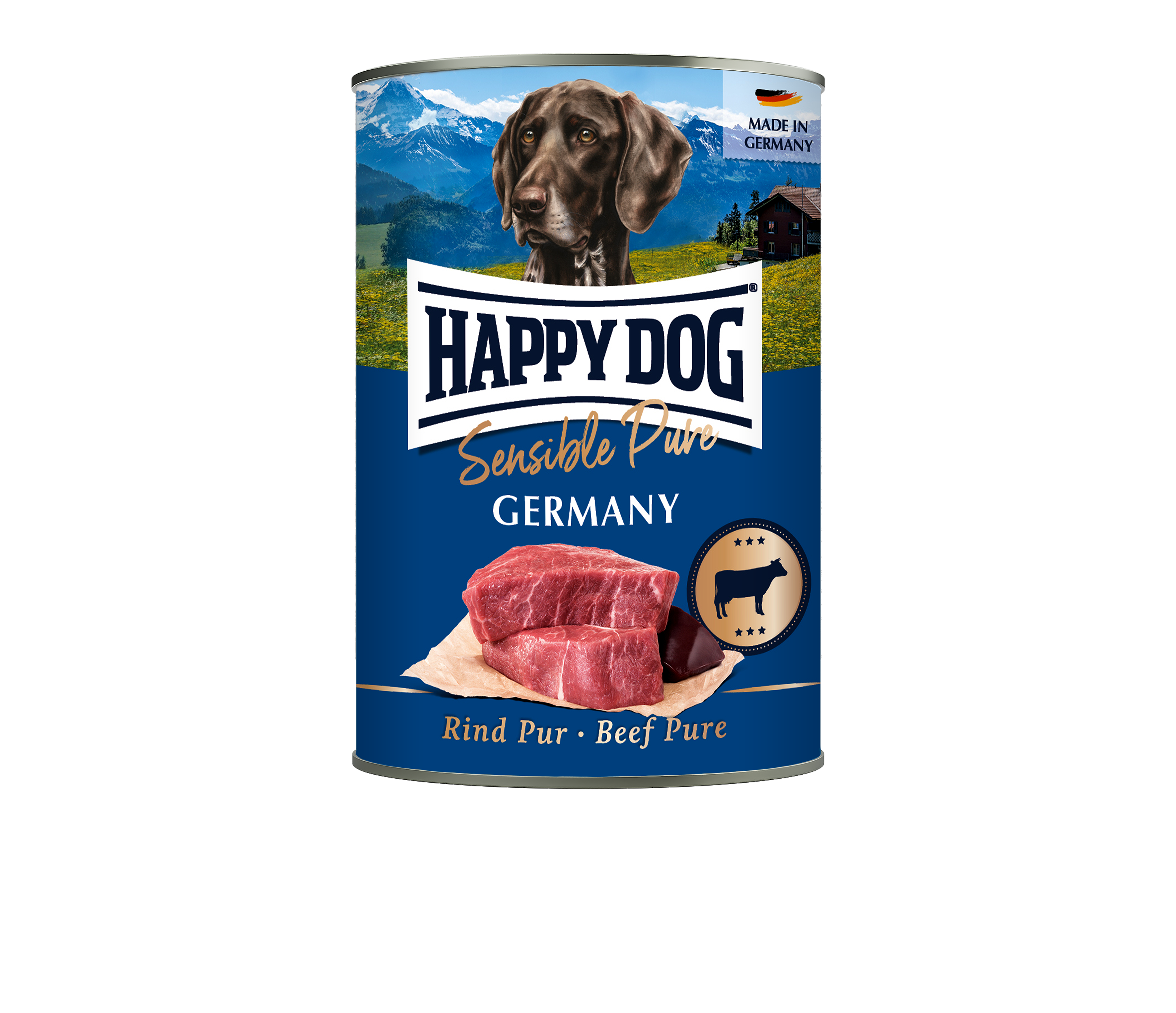 Happy Dog Sensible Pure Germany Nassnahrung wird zu 100 % aus wertvollem Rindfleisch und -innereien in Deutschland hergestellt. Es enthält keinerlei Getreide und wird ohne Zuckerzusatz hergestellt. Durch die Verwendung von Rind als alleiniger tierischer Rohproteinquelle eignet es sich besonders zur Fütterung bei Futtermittelunverträglichkeiten. Sensible Pure Germany kann als Alleinnahrung gefüttert werden oder in Kombination mit Happy Dog Flockenmixer oder Happy Dog Trockenfutter.