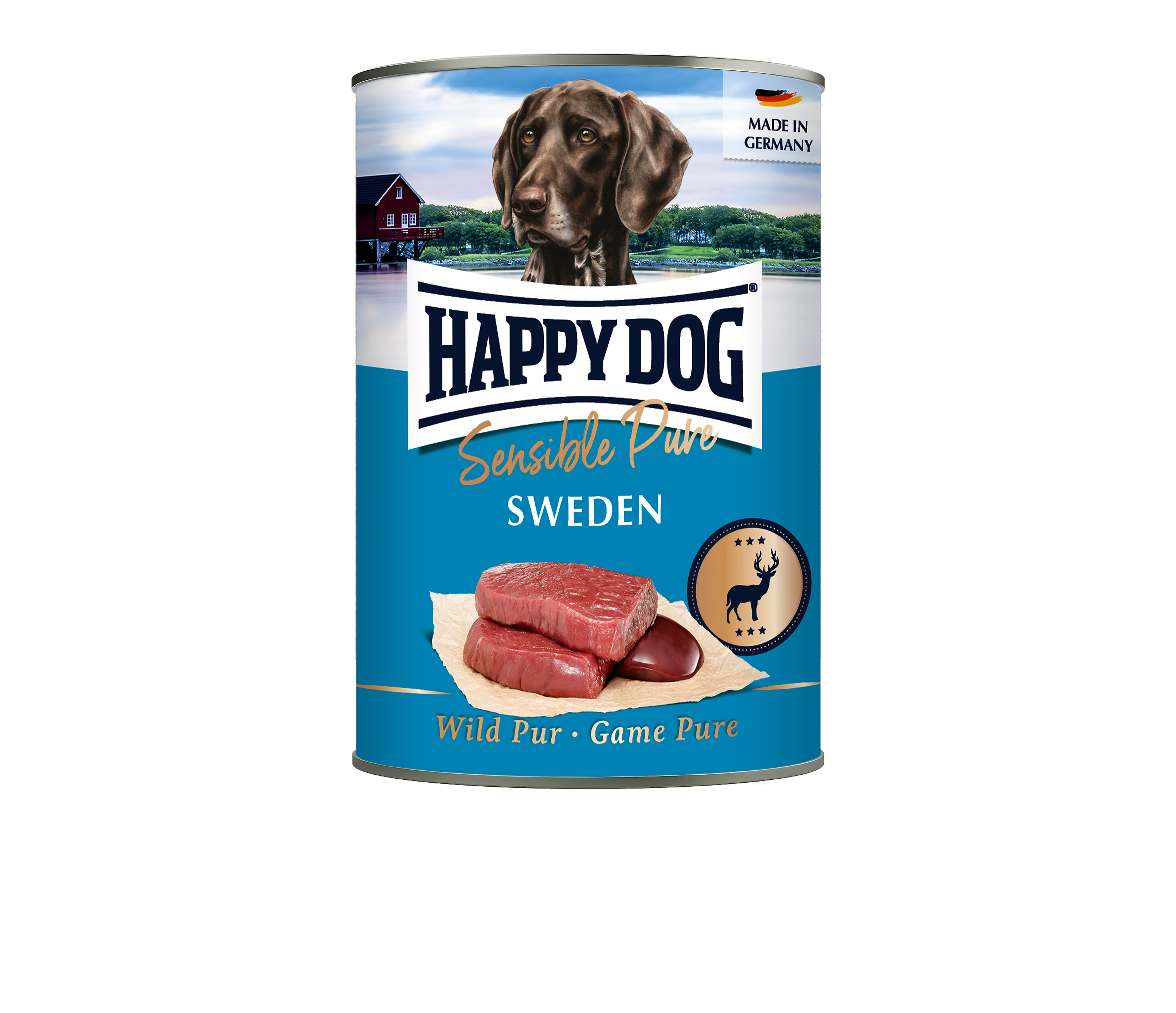 Happy Dog Sensible Pure Sweden Nassnahrung wird zu 100 % aus wertvollem Wildfleisch und -innereien in Deutschland hergestellt. Es enthält keinerlei Getreide und wird ohne Zuckerzusatz hergestellt. Durch die Verwendung von Wild als alleiniger tierischer Rohproteinquelle eignet es sich besonders zur Fütterung bei Futtermittelunverträglichkeiten. Sensible Pure Sweden kann als Alleinnahrung gefüttert werden oder in Kombination mit Happy Dog Flockenmixer oder Happy Dog Trockenfutter.