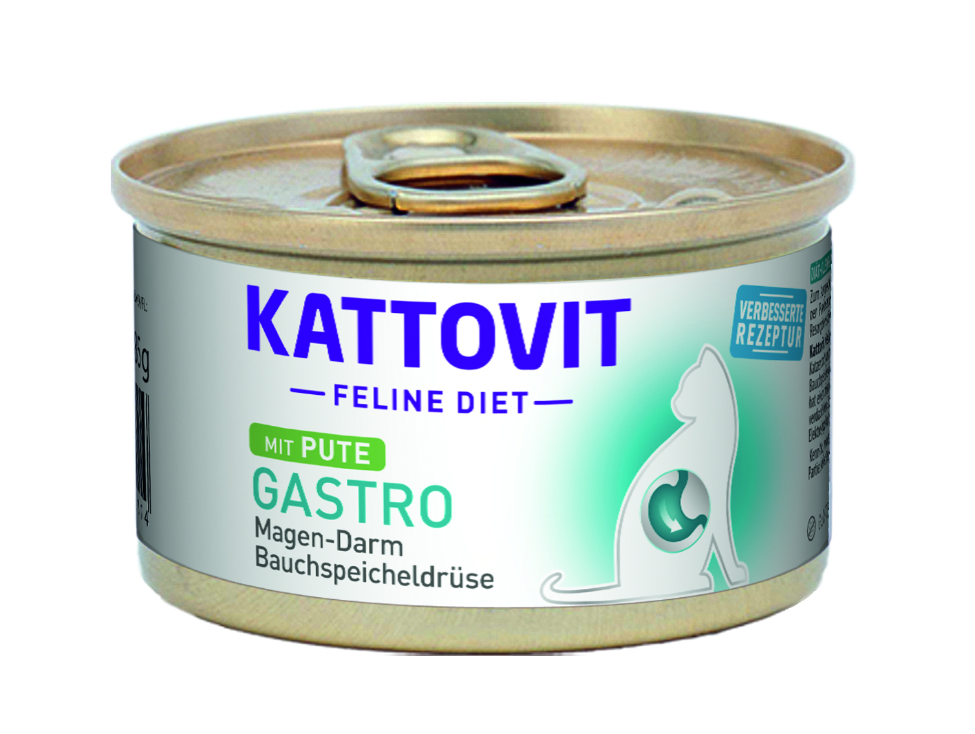 Kattovit Feline Diet Gastro – Magen-Darm / Bauchspeicheldrüse (i-Rezeptur) 85g-Dosen. Zum Ausgleich unzureichender Verdauung und exokriner Pankreasinsuffizienz sowie zur Linderung akuter Resorptionsstö-rungen des Darms. Kattovit Feline Diet – Gastro wurde speziell für Katzen mit gastro-intestinalen Problemen (Magen-Darm, Bauchspeicheldrüse) entwickelt. Dieses Diätfuttermittel hat einen niedrigen Rohfett in einer besonders leicht verdaulichen Zusammensetzung sowie einen erhö-hten Elektrolytgehalt.