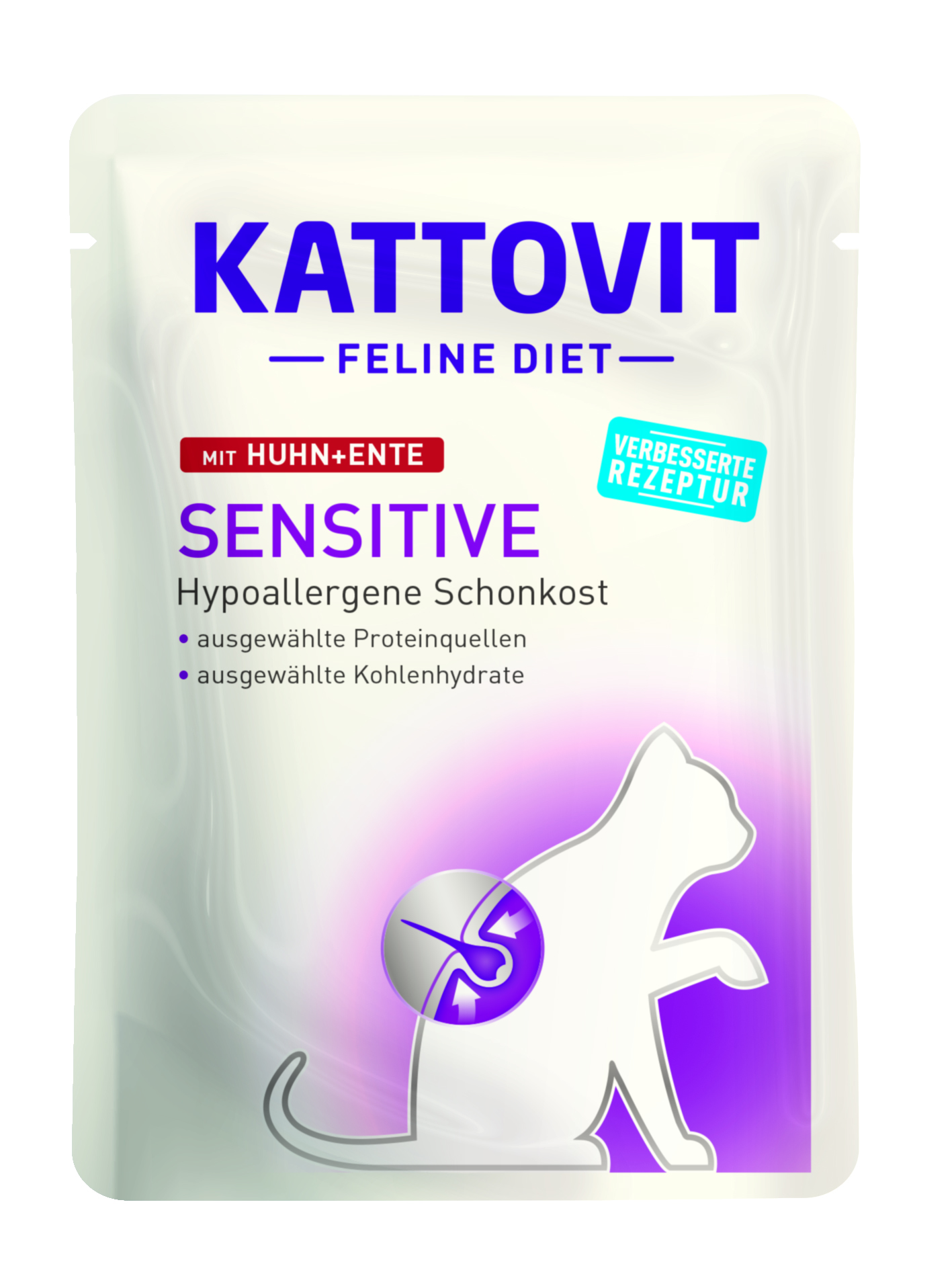 Kattovit Feline Diet Sensitive – Hypoallergene Schonkost – D-Rezeptur. Zur Minderung von Ausgangerzeugnis- und Nährstoffintoleranzerscheinungen (auch mit Haut- und Fellproblemen). Kattovit Feline Diet – SENSITIVE für sensible Katzen, die unter bestimmten Futtermittelallergien leiden. Exklusions-Diät: Es werden ausschließlich die Fleischsorten verwendet, wie in der Sorte genannt. Auf die Beifütterung von Leckereien sollte verzichtet werden.