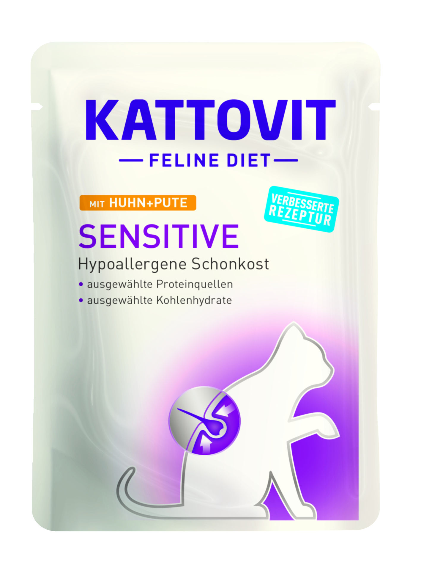 Kattovit Feline Diet Sensitive – Hypoallergene Schonkost – D-Rezeptur. Zur Minderung von Ausgangerzeugnis- und Nährstoffintoleranzerscheinungen (auch mit Haut- und Fellproblemen). Kattovit Feline Diet – SENSITIVE für sensible Katzen, die unter bestimmten Futtermittelallergien leiden. Exklusions-Diät: Es werden ausschließlich die Fleischsorten verwendet, wie in der Sorte genannt. Auf die Beifütterung von Leckereien sollte verzichtet werden.