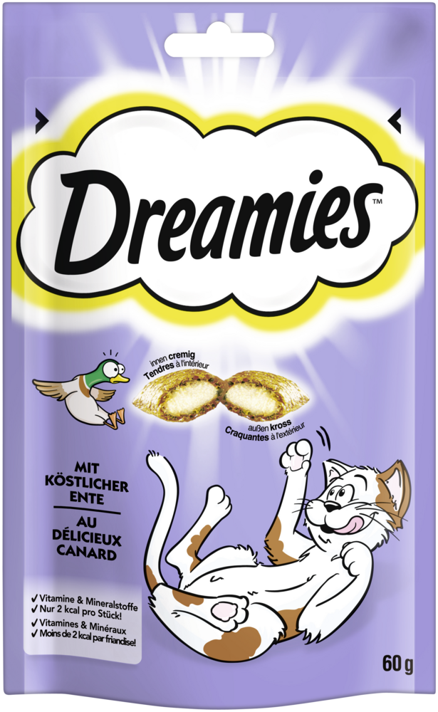 Quack, quack, quaaack. Übersetzt heißt das: Diese k&ouml-stlichen Leckerlis mit Ente sind das ideale Mitbringsel für deinen vierbeinigen Freund. Außen kross, innen cremig: Katzen sind verrückt nach dem unwiderstehlichen Geschmack von DREAMIES&trade- Katzensnacks mit Ente. Dazu nutzen wir keine geheime Zutat, sondern verwenden für DREAMIES&trade- nur Zutaten, die Katzen besonders lieben. Schüttel den Beutel und sieh zu, wie Deine Katze angerannt kommt.