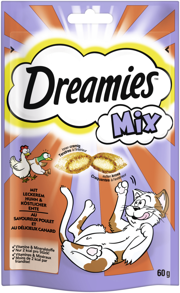 • DREAMIES&trade- Mix ist erhältlich mit Huhn & Ente, Lachs & Käse sowie Käse & Rind
