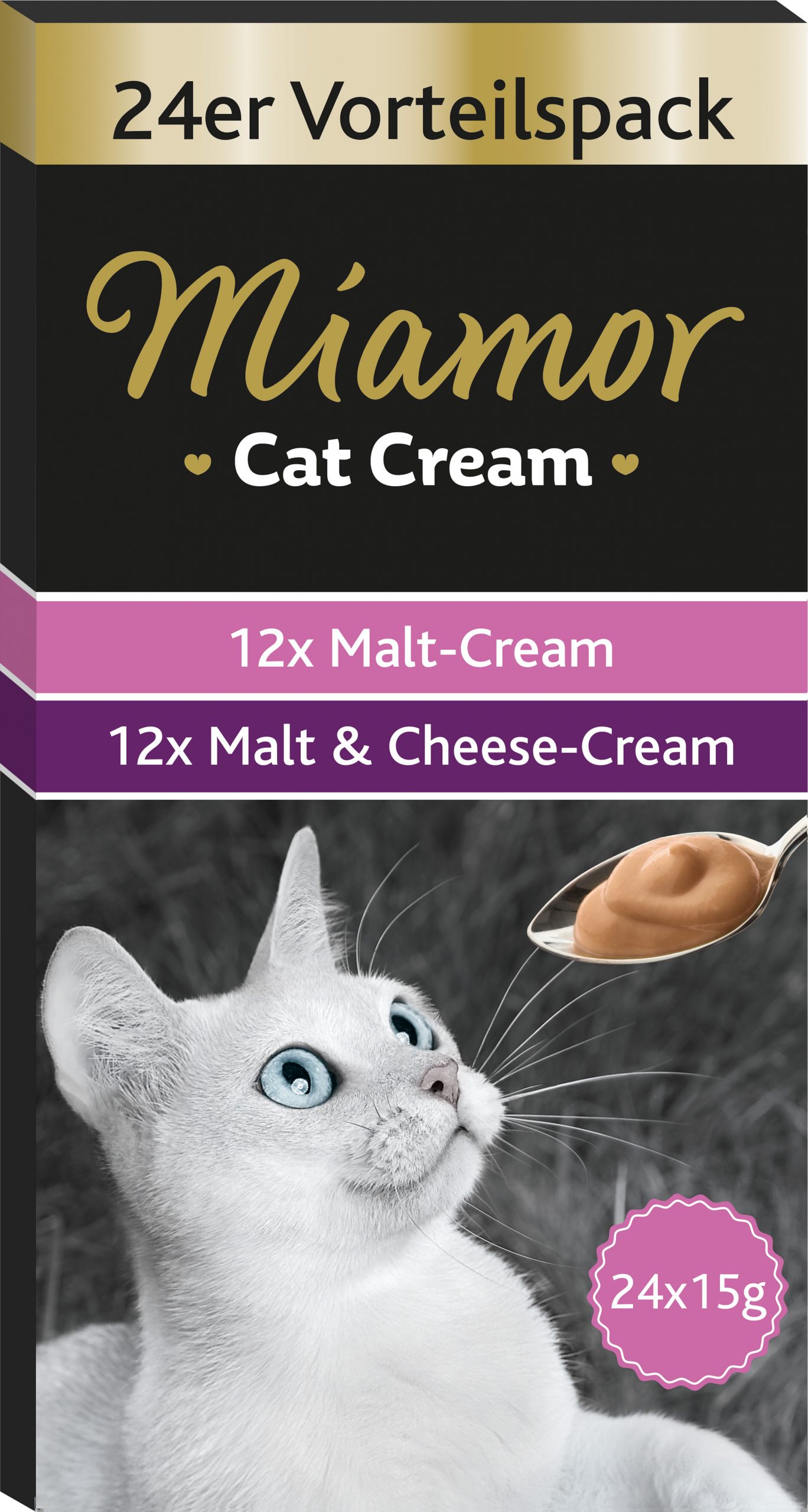 Malt-Cream + Kä-se: Fleisch und tierische Nebenerzeugnisse, pflanzliche Nebenerzeugnisse (u.a. 10% Malz), Milch und Molkereierzeugnisse (4% Kä-se).