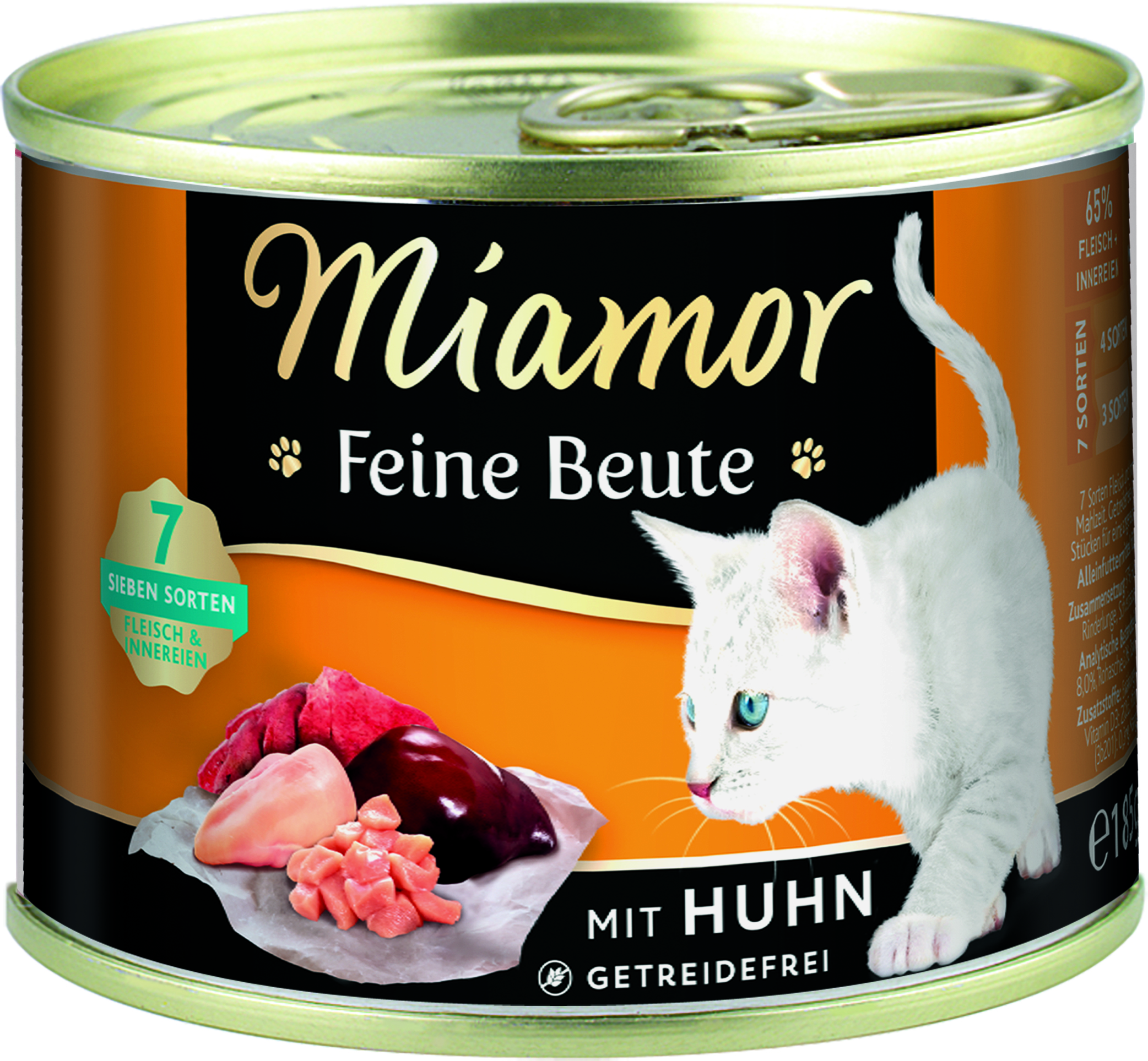 Miamor Feine Beute – 7 Sorten Fleisch & Innereien. 65% Fleisch & Innereien. Miamor Feine Beute: 7 Sorten für 7 Leben. Eine ausgewogene Fleischkomposition für ein langes Katzenleben. Getreidefrei und artgerecht, denn Katzen sind von Natur aus Fleischfresser (Carnivore).