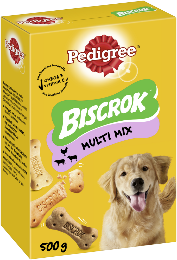 Knusprige Hundeleckerlis voller Geschmack – PEDIGREE®- BISCROK&trade- Original sind perfekt gebackene, knusprige Hundekekse in den kö-stlichen Geschmacksrichtungen Huhn, Rind und Lamm